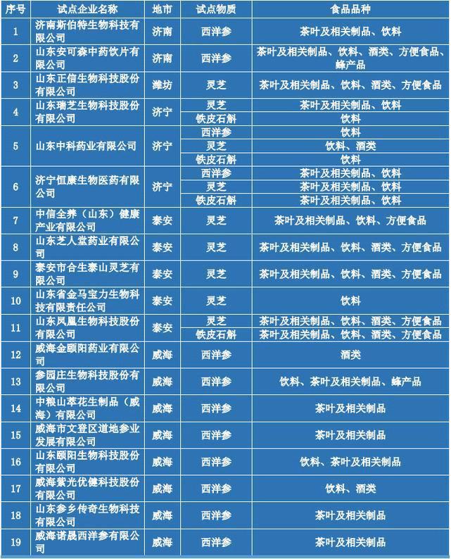 根据国家卫健委、市场监管总局要求,山东省对西洋参、铁皮石斛、灵芝等三种物质开展按照传统既是食品又是中药材的物质管理试点。截至目前,全省已有34家企业取得试点资质。其中,山东安可森中药饮片有限公司等22家企业对西洋参开展试点;山东凤凰生物科技股份有限公司等12家企业对铁皮石斛开展试点;山东瑞芝生物科技股份有限公司等21家企业对灵芝开展试点。具体试点企业名单如下。